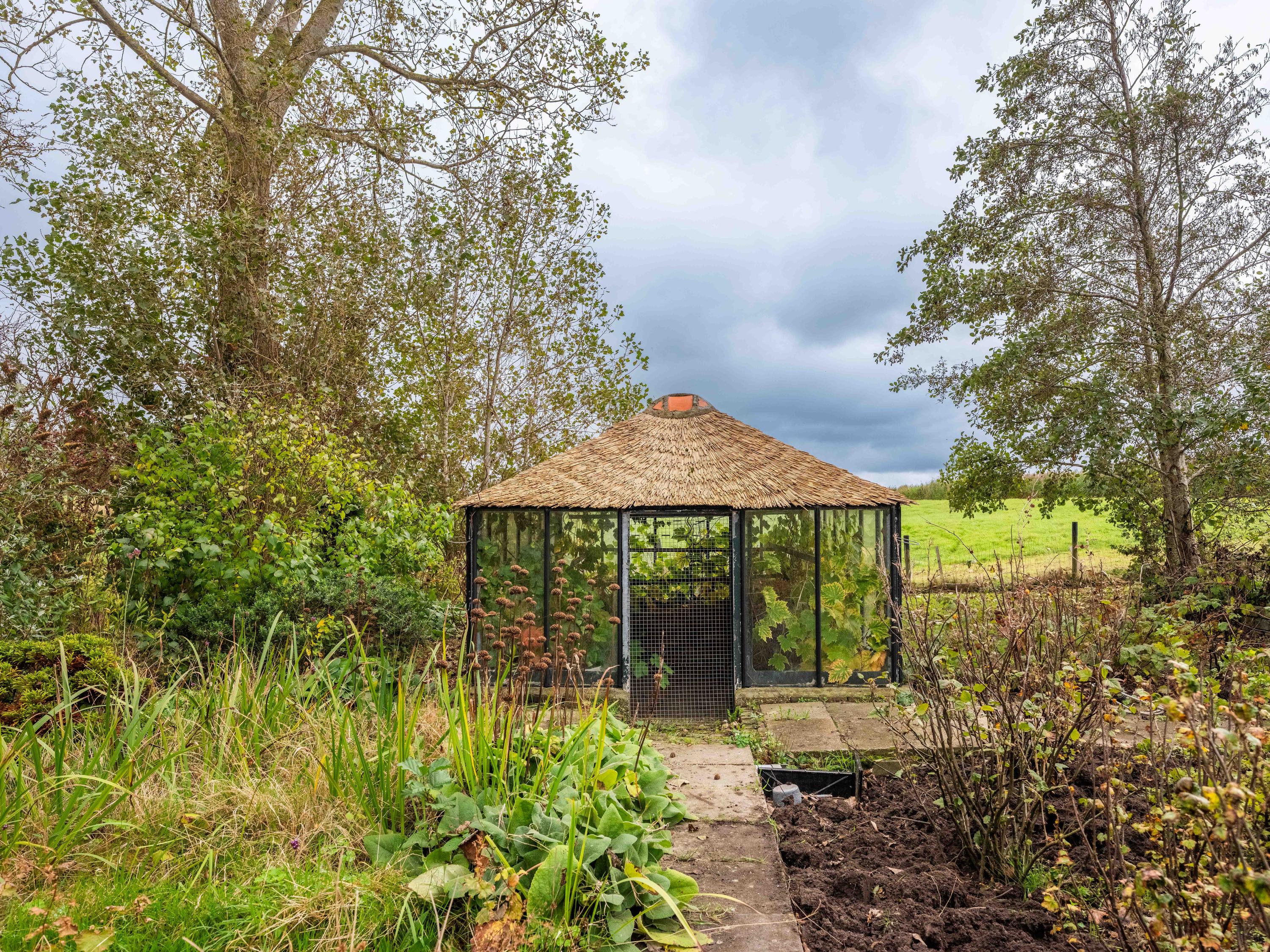 In de fraai aangelegde tuin bevindt zich een volledig ingericht gastenverblijf met een eigen houtkachel, open keuken met complete apparatuur, wasmachine en droger, eetruimte en radiatoren. De slaapkamer beschikt over een eigen douche, terwijl er ook een separaat toilet met wastafel aanwezig is. Bovenin biedt een zolder extra bergruimte.