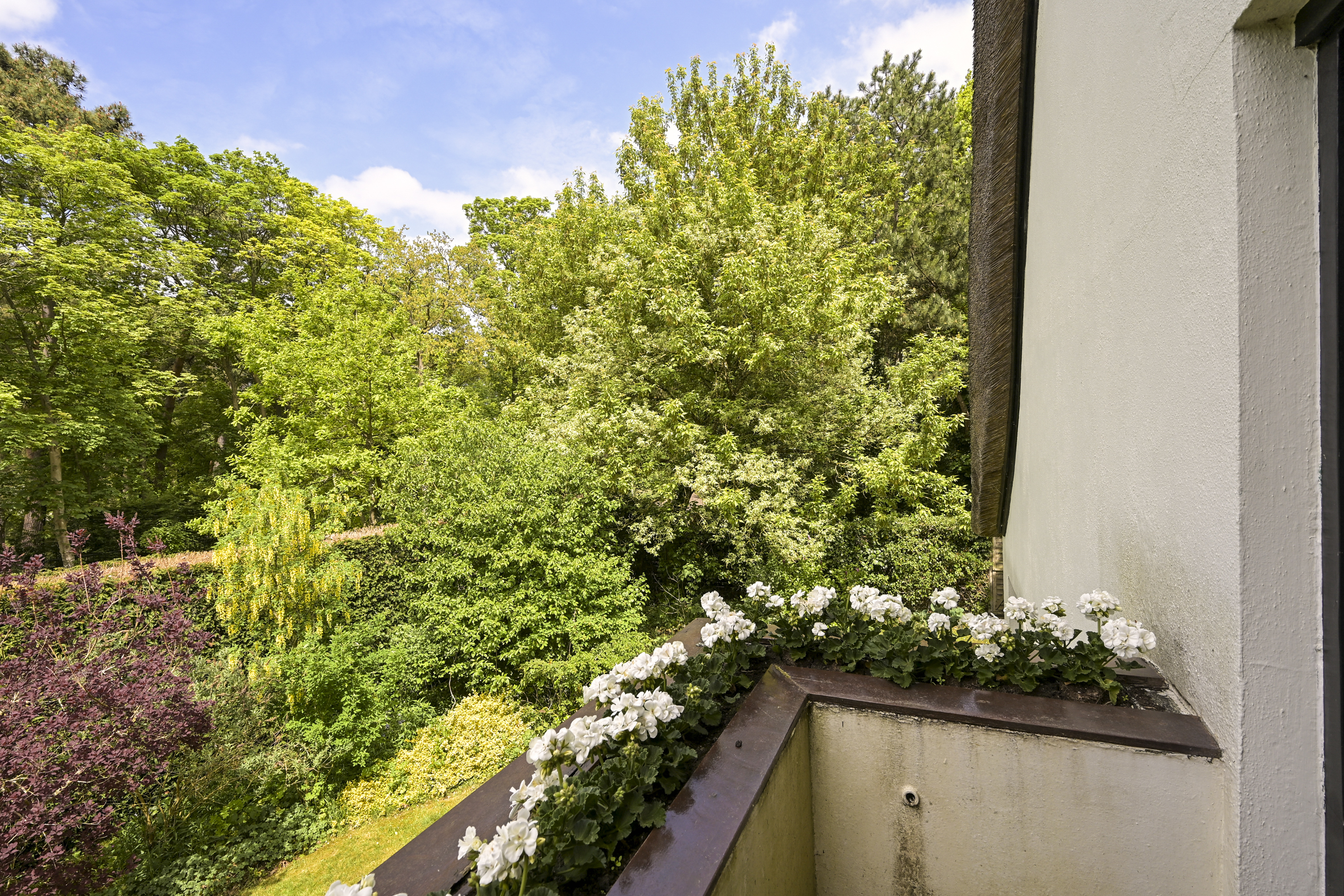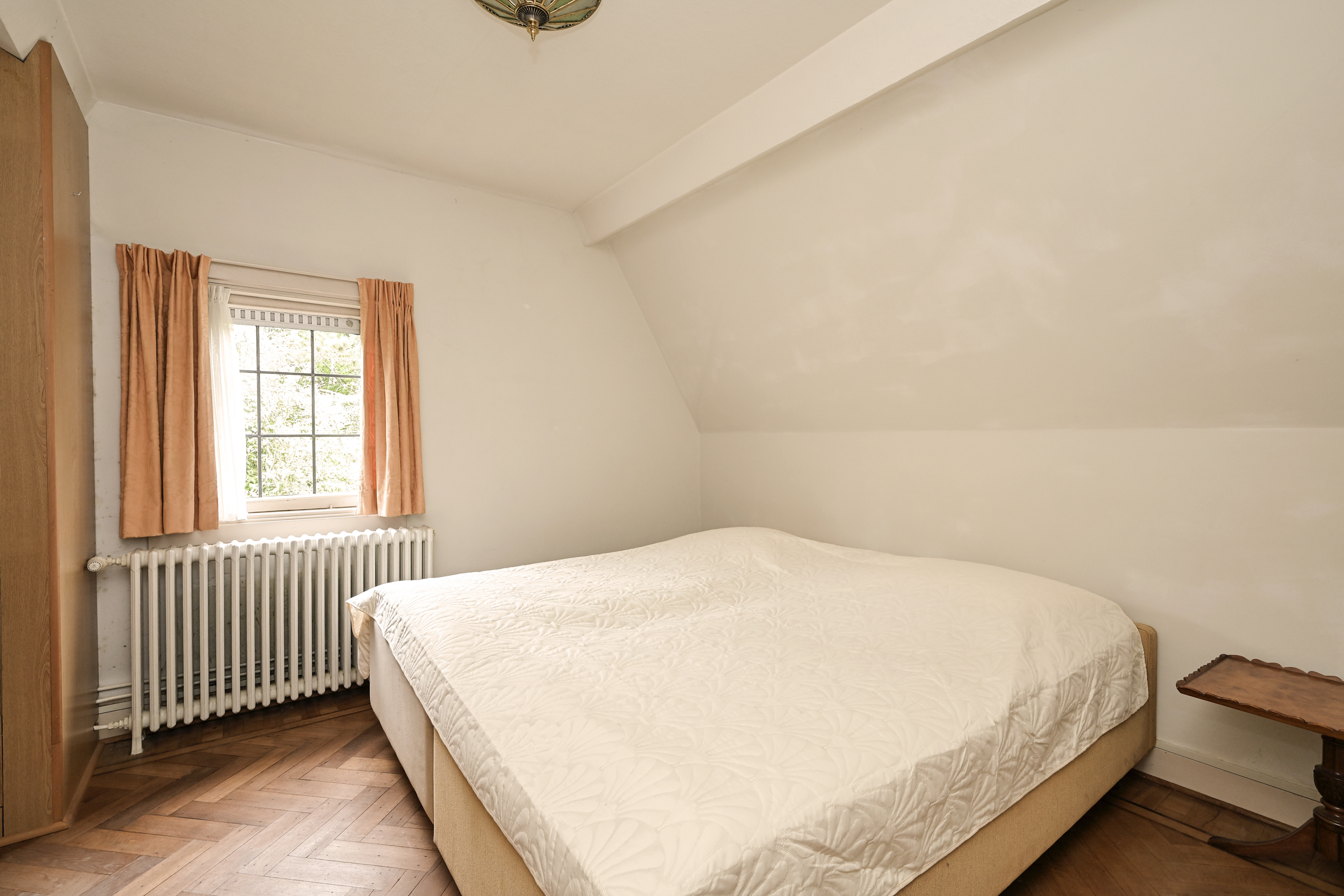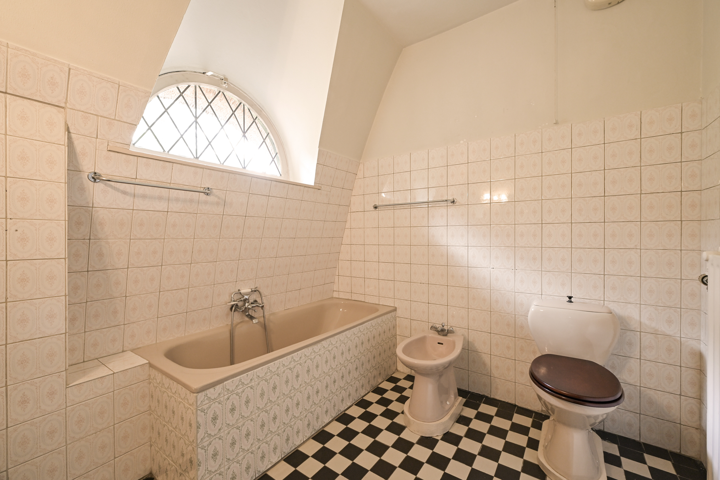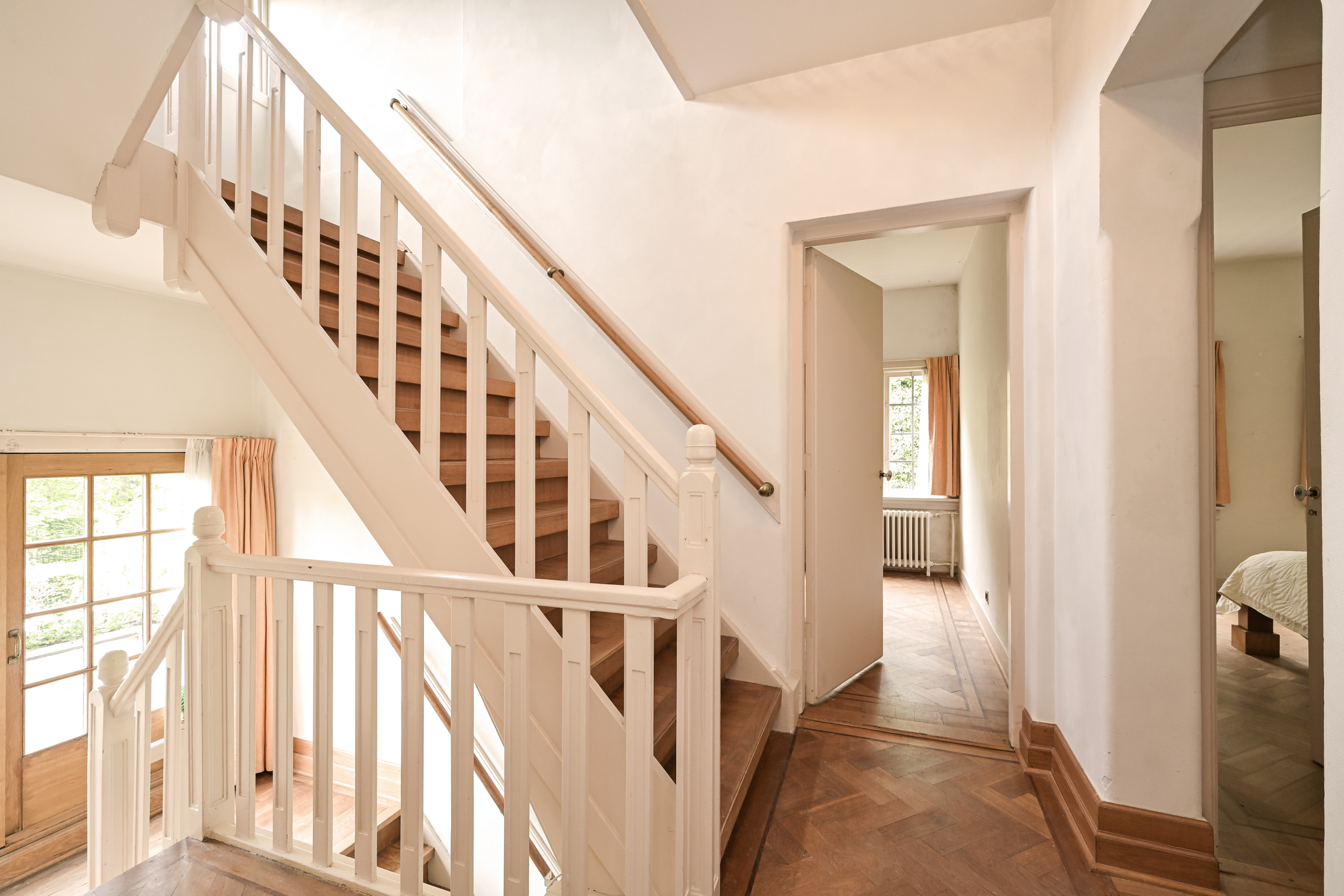 Het fraaie lichte bordestrappenhuis met halverwege toegang tot een balkon leidt naar de 1e verdieping waar we naast een eenvoudige badkamer en een aparte douche een fraaie studeerkamer met toegang tot ruim balkon vinden en twee ruime slaapkamers. Zoals benoemd zijn alle vertrekken voorzien van eiken parketvloeren.
