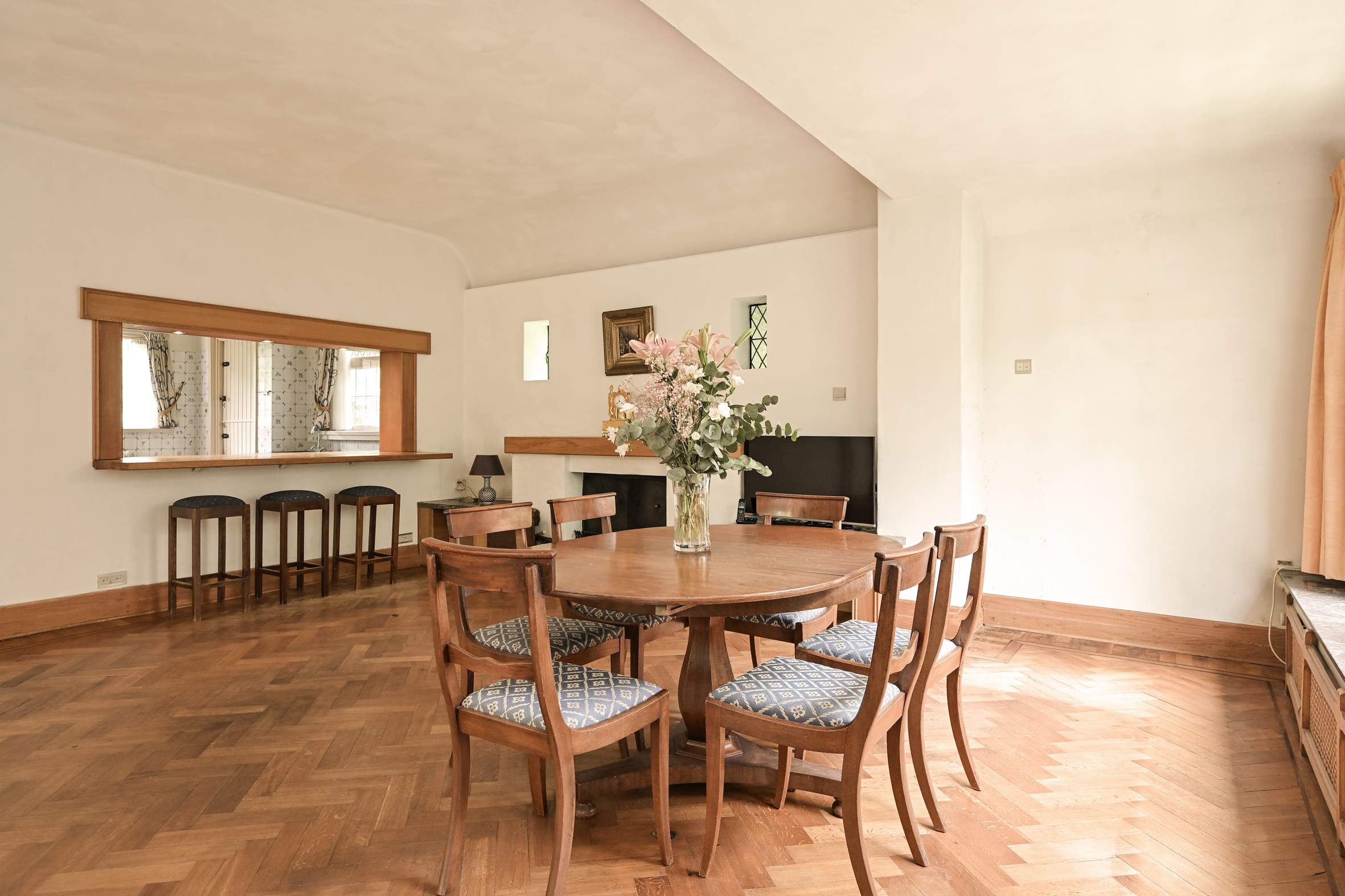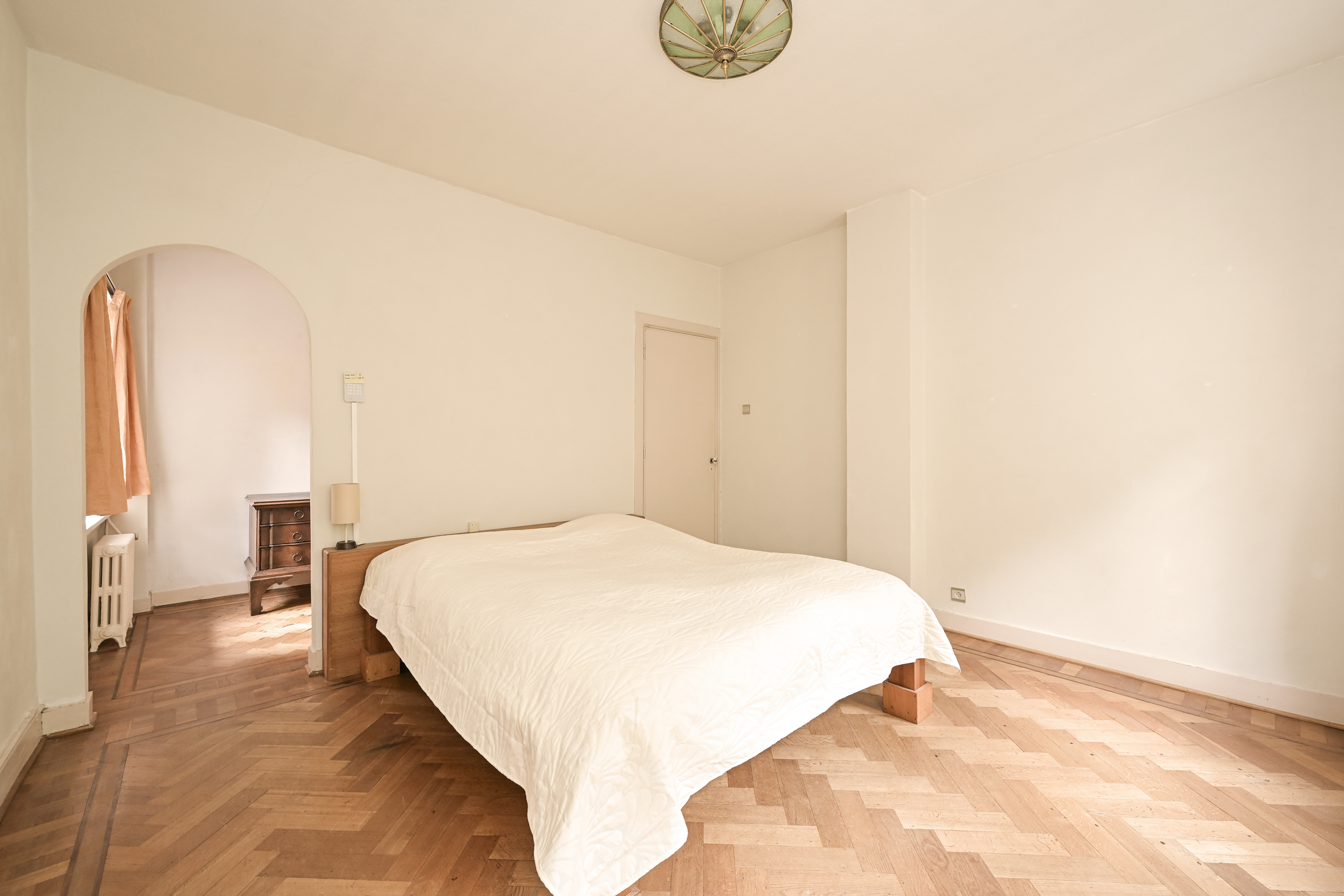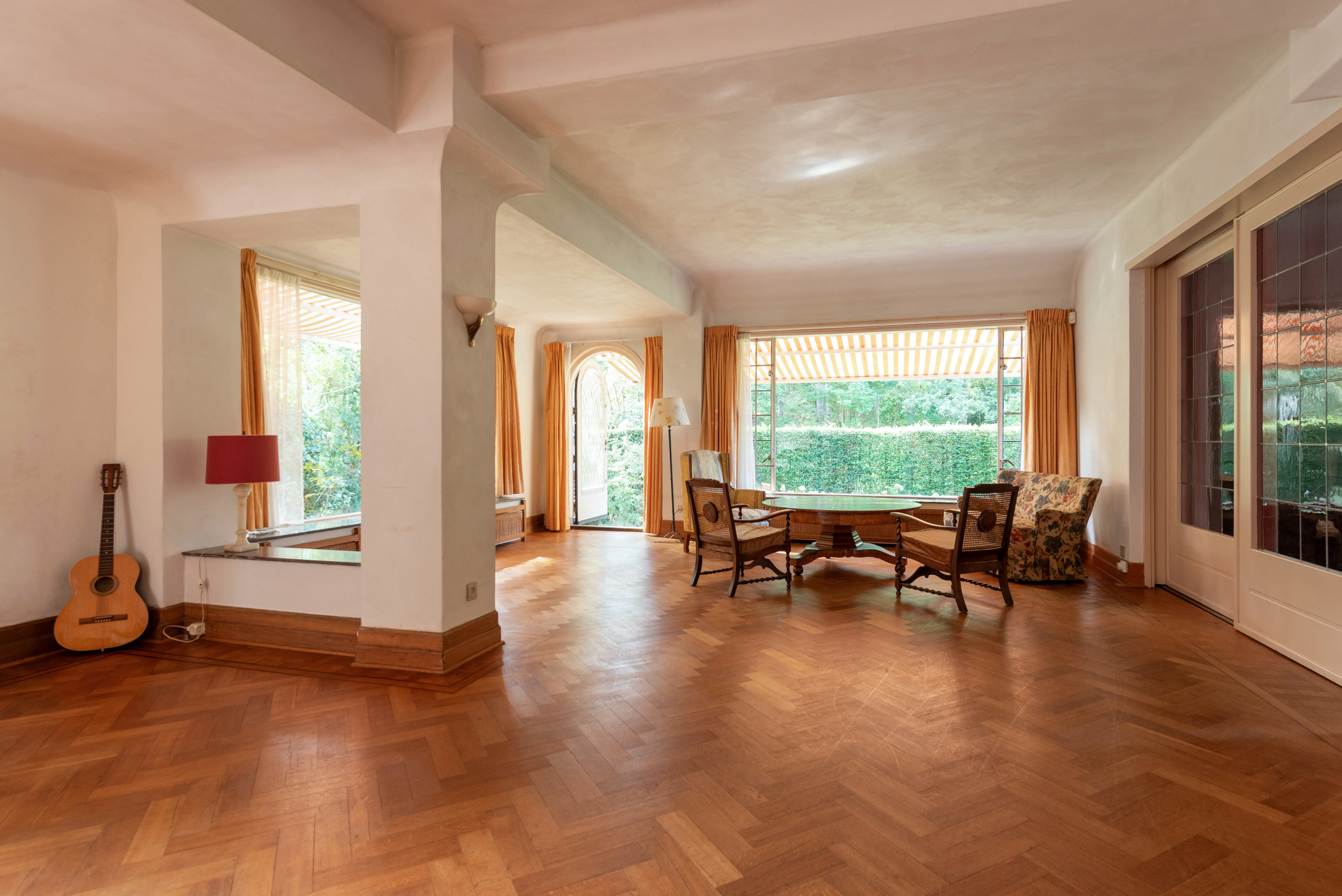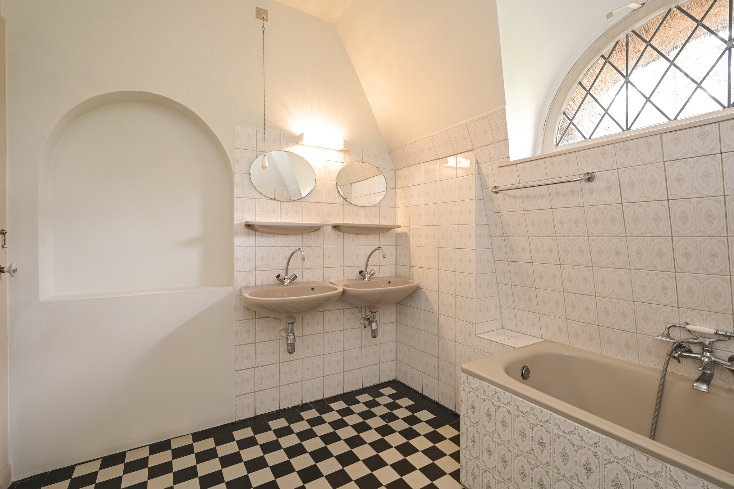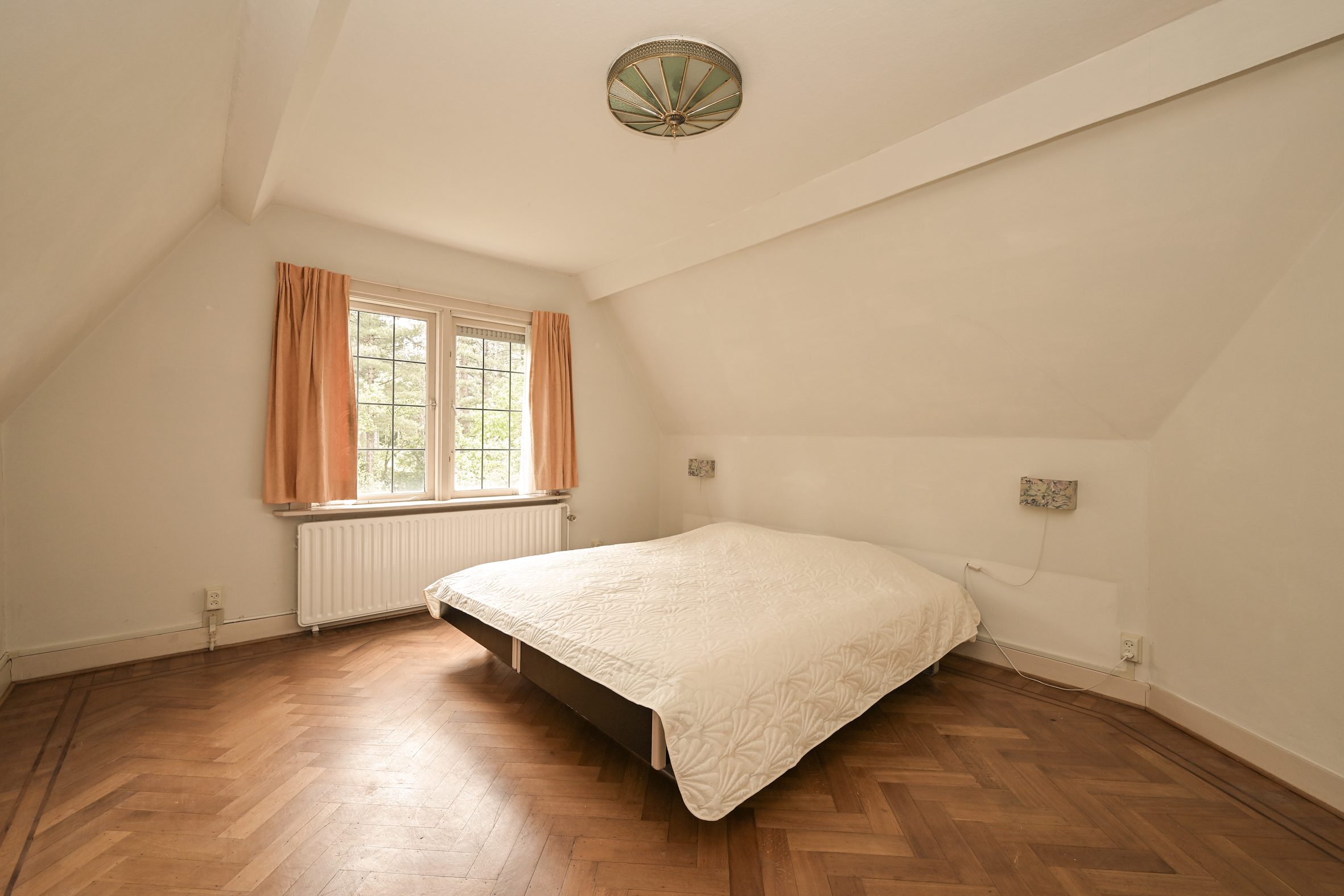 Het fraaie lichte bordestrappenhuis met halverwege toegang tot een balkon leidt naar de 1e verdieping waar we naast een eenvoudige badkamer en een aparte douche een fraaie studeerkamer met toegang tot ruim balkon vinden en twee ruime slaapkamers. Zoals benoemd zijn alle vertrekken voorzien van eiken parketvloeren.