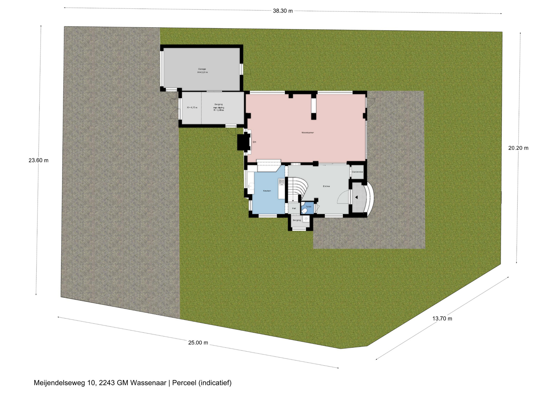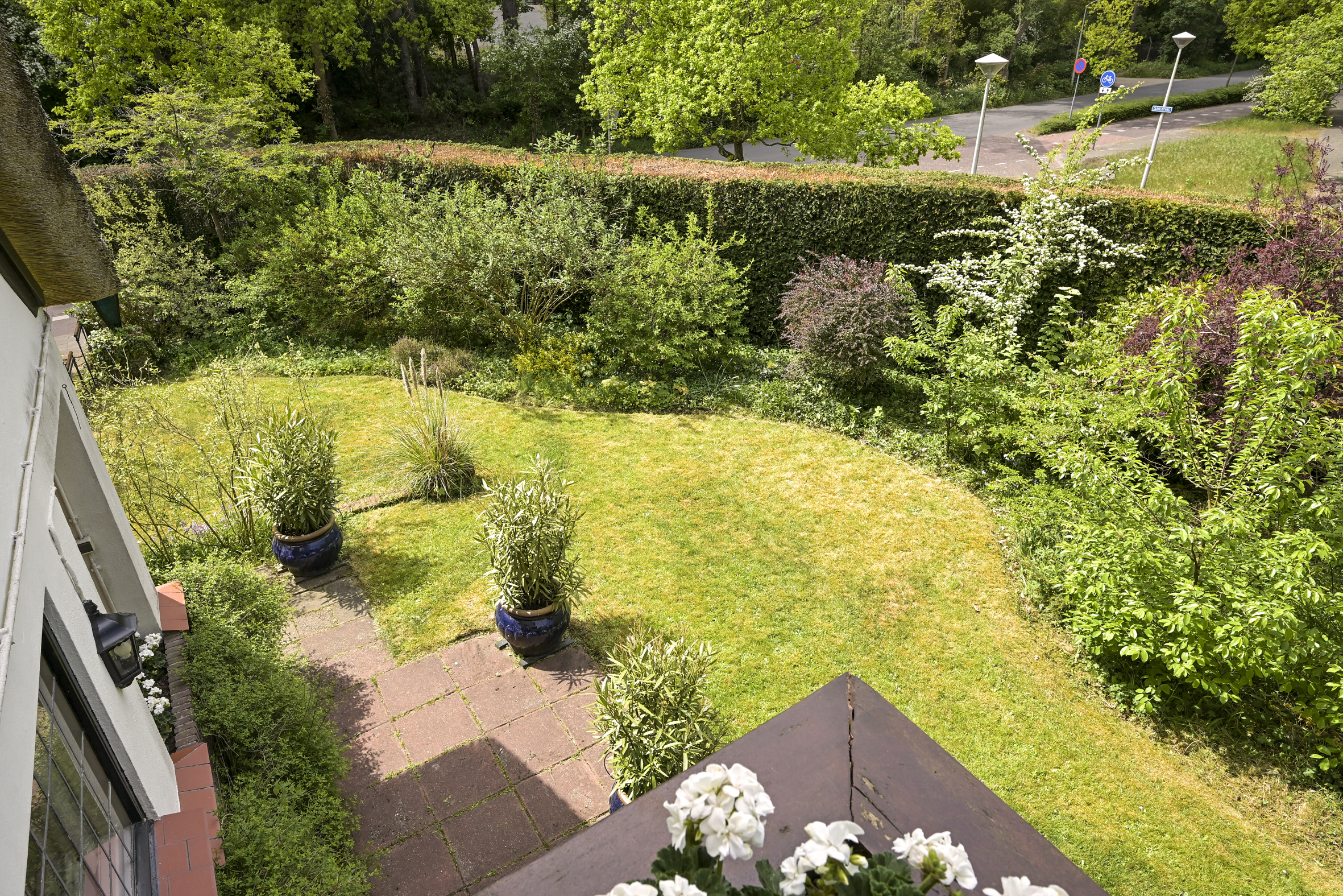 De tuin ligt half rondom de woning en is vrij gelegen en dus heel zonnig. Naast de oorspronkelijke garage die ooit verbonden was met de eetkamer en dus eenvoudig bij het huis zou kunnen worden getrokken is een nieuwere grote garage op het perceel aangebouwd die voor vele doeleinden geschikt is. Deze laatste heeft een automatische kanteldeur en heeft een doorloop naar de achtertuin.