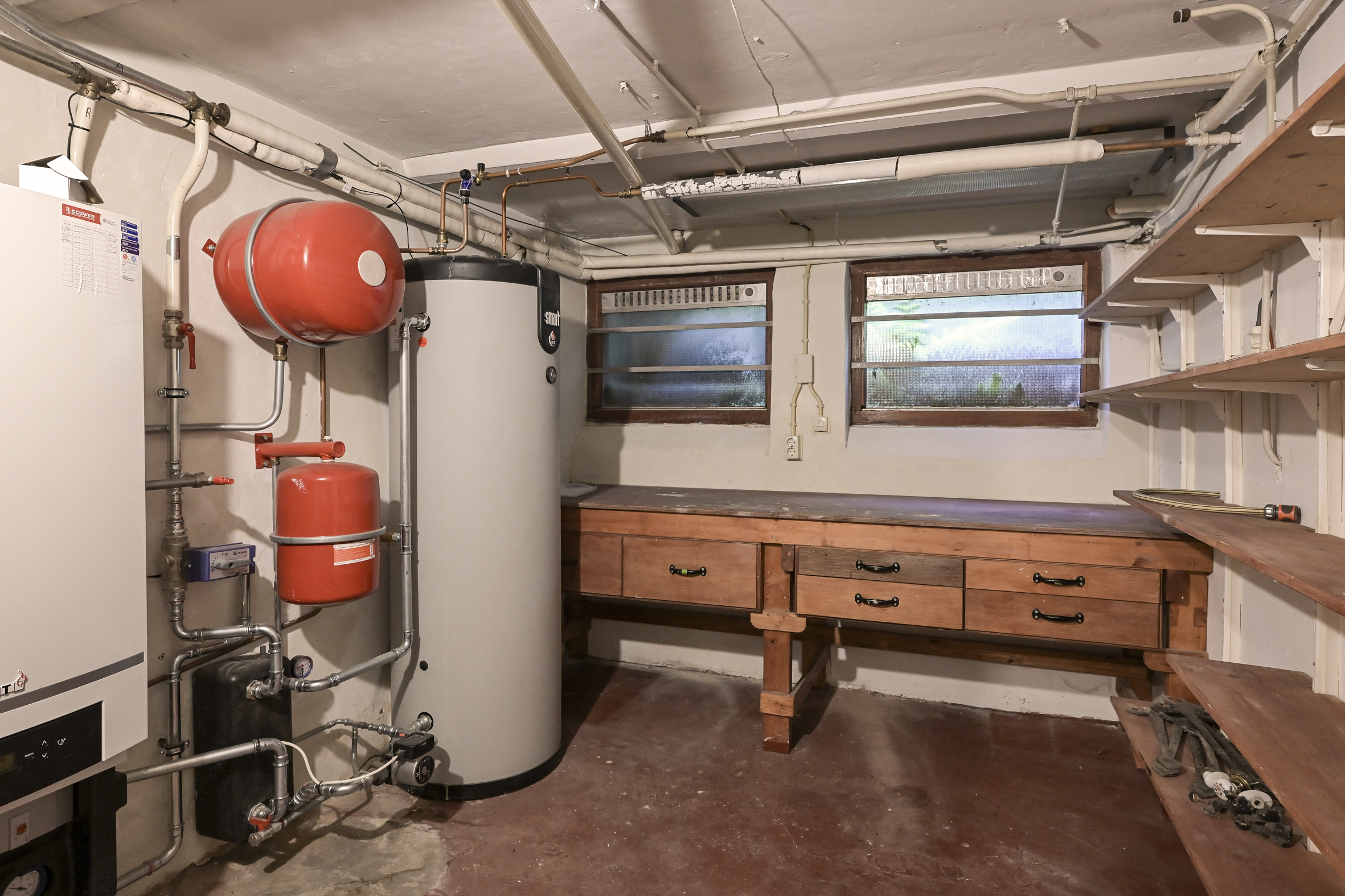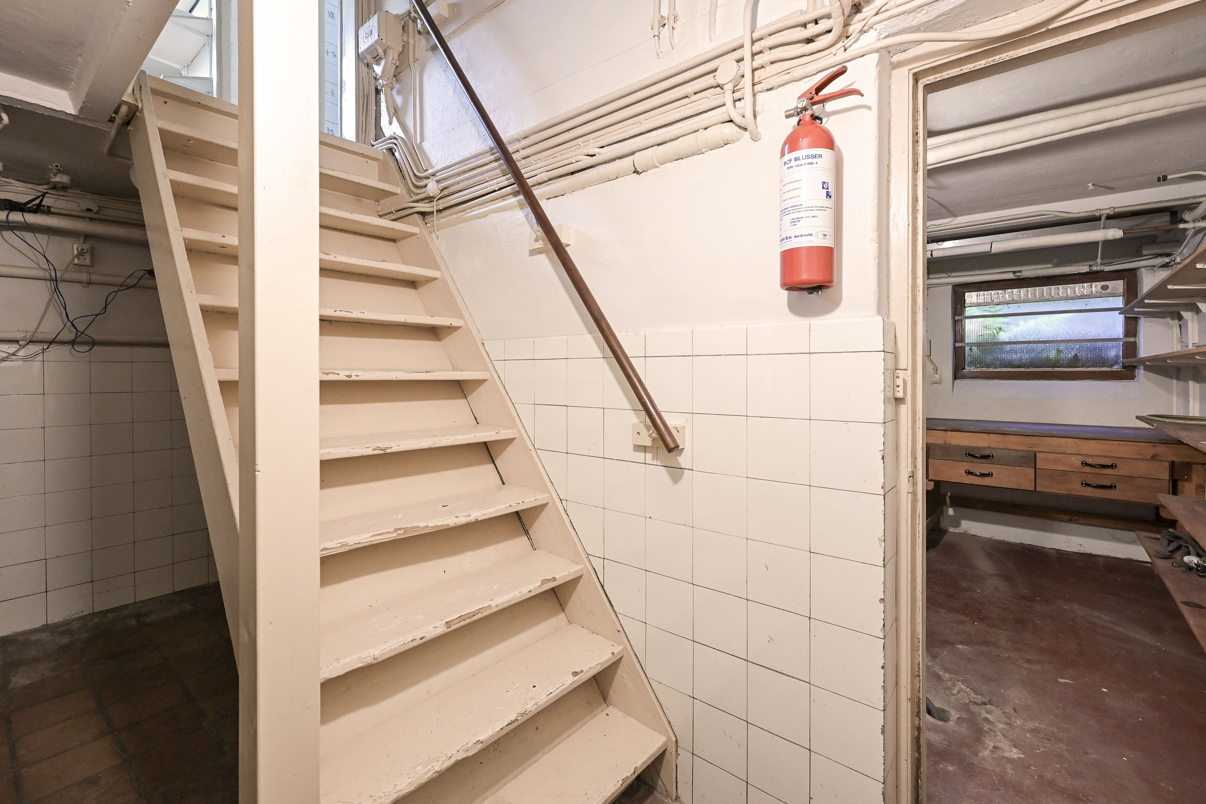 Indeling: entree, royale ontvangsthal met fraaie in mozaïek gelegde vloer, riant trappenhuis, eenvoudige wc met fonteintje. Dubbele schuifdeuren met glas in lood ramen naar ruime lichte zit/eetkamer met eiken parketvloeren, open haard, marmeren vensterbanken en toegang tot de zonnige tuin. Vanuit de centrale hal is de ruime nette keuken bereikbaar die middels een halfopen verbinding in contact met eetkamer staat. De keuken heeft een achter entree en heeft een aangrenzende bijkeuken met toegang tot de kelder die uit drie praktische ruimtes bestaat.
