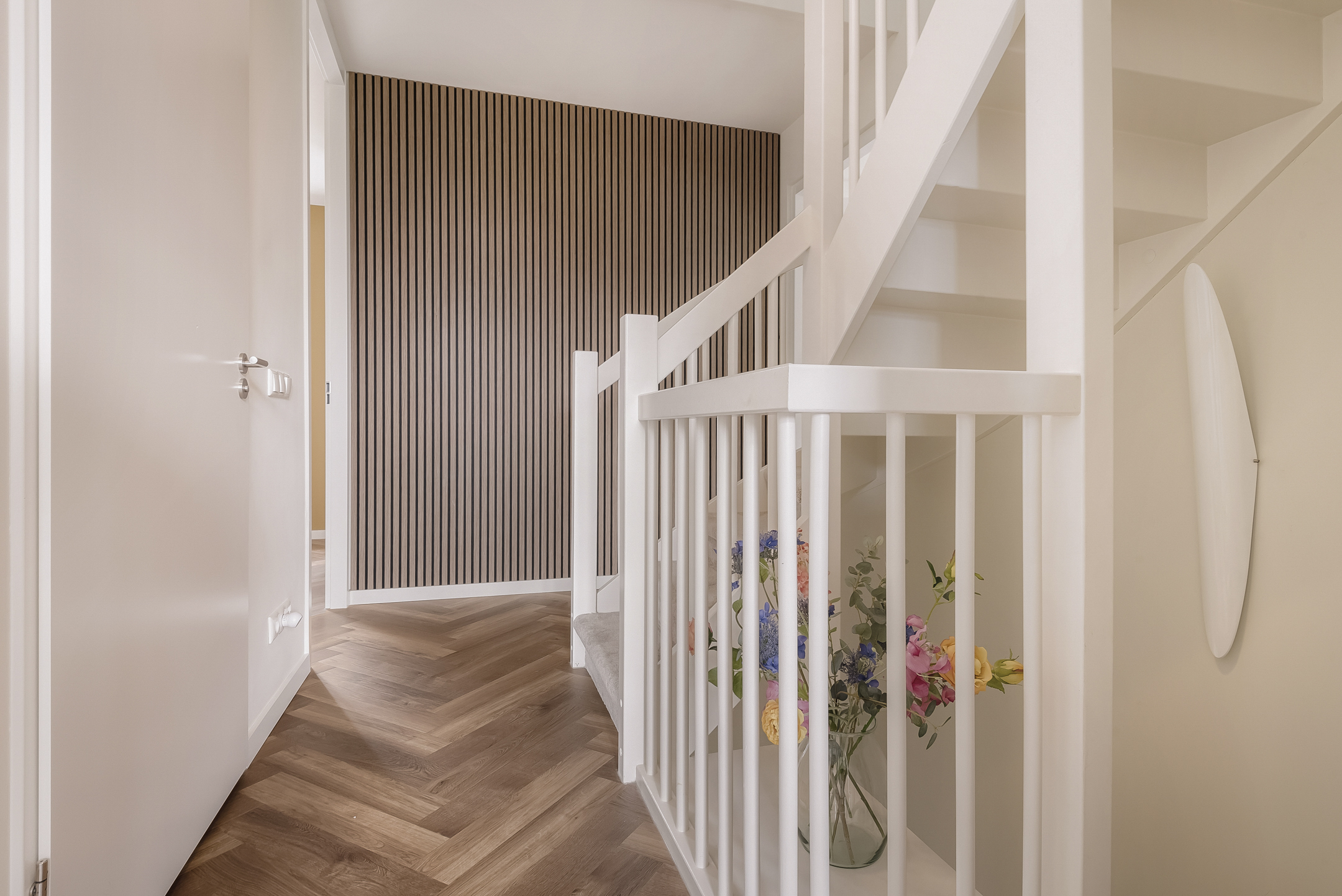 De entreehal met stijlvolle lambrisering, een modern toiletruimte en meterkast geeft toegang tot de lichte woonkamer en open woonkeuken. Aan de voorzijde van de woning bevindt zich de sfeervolle woonkamer.