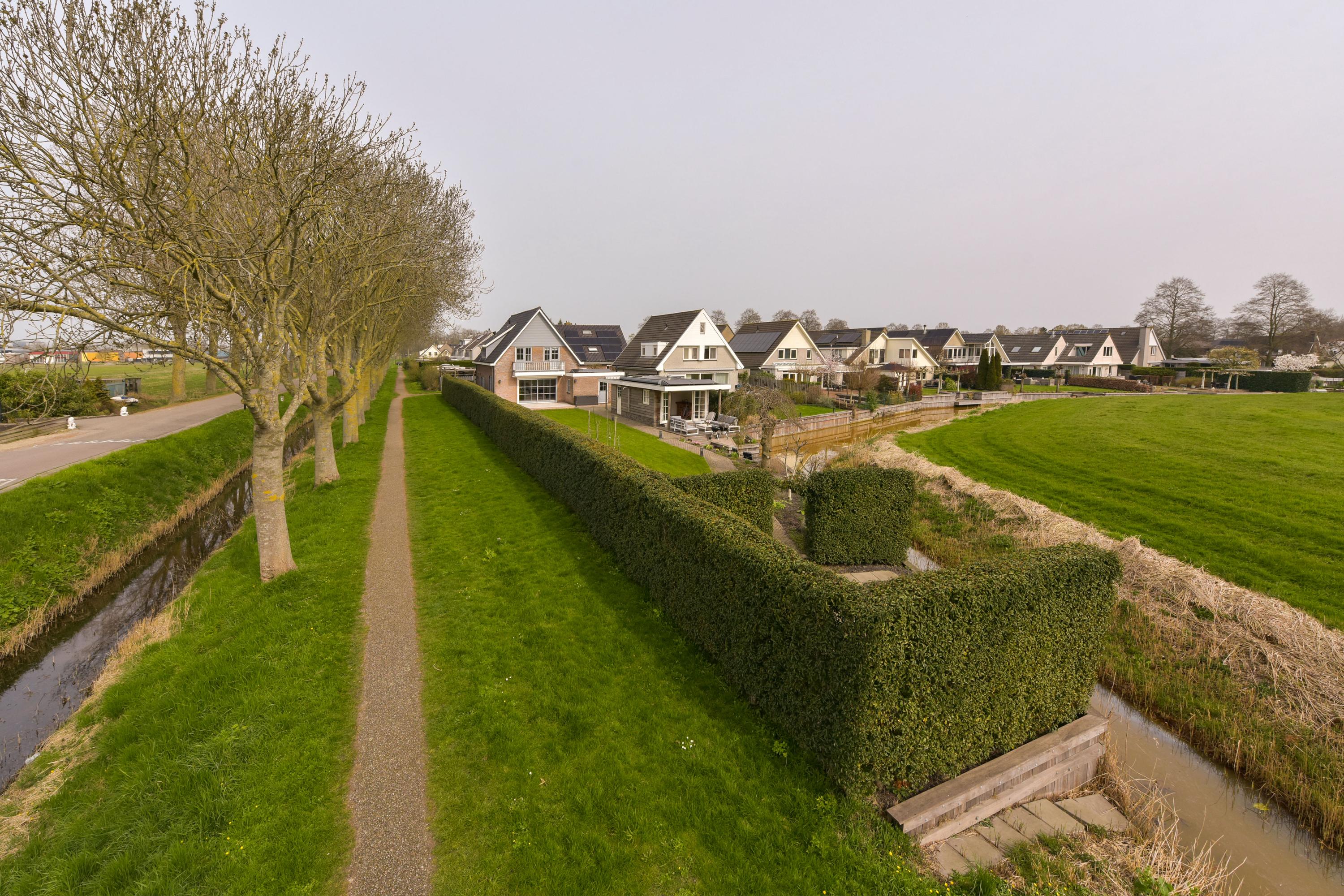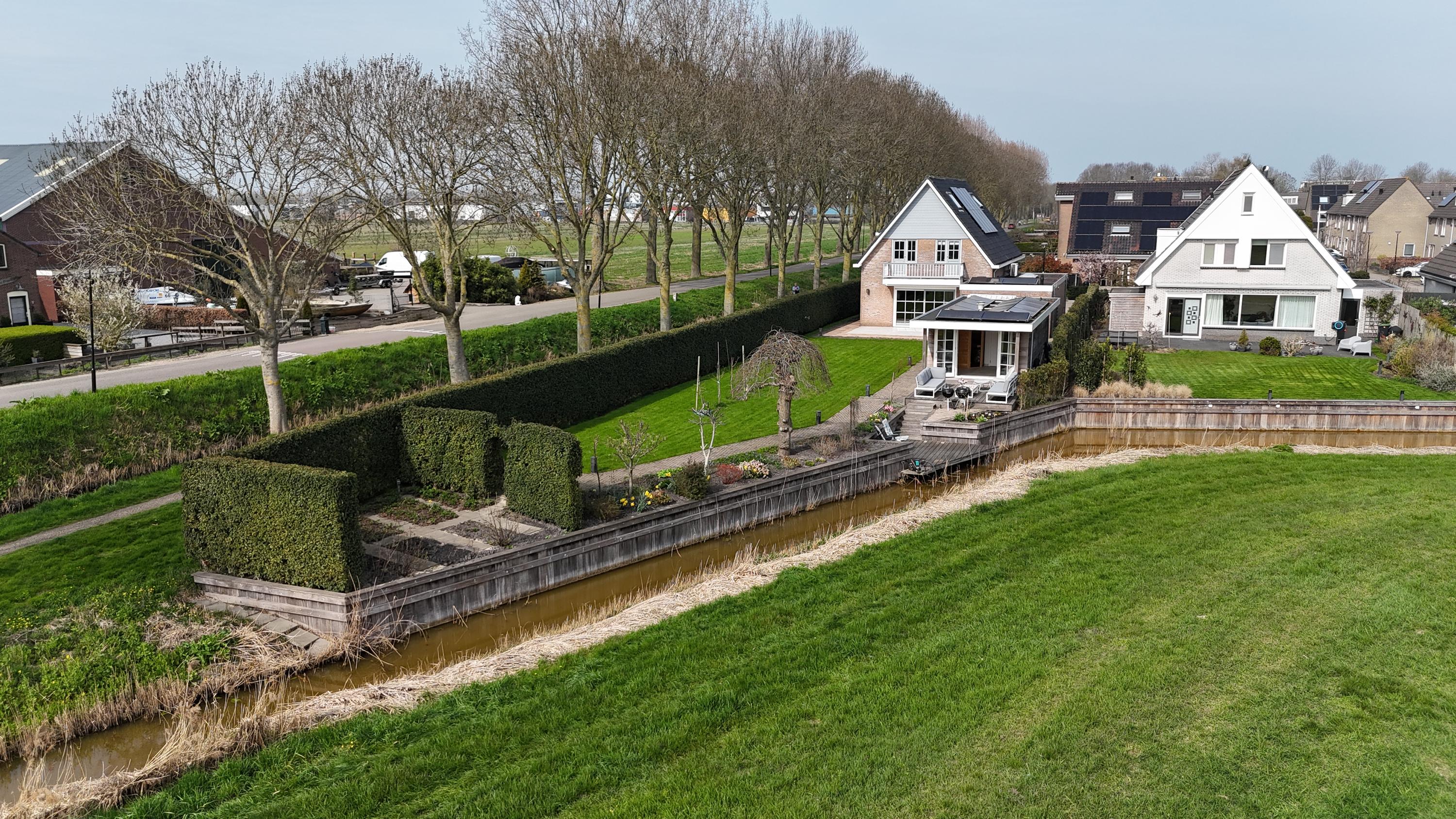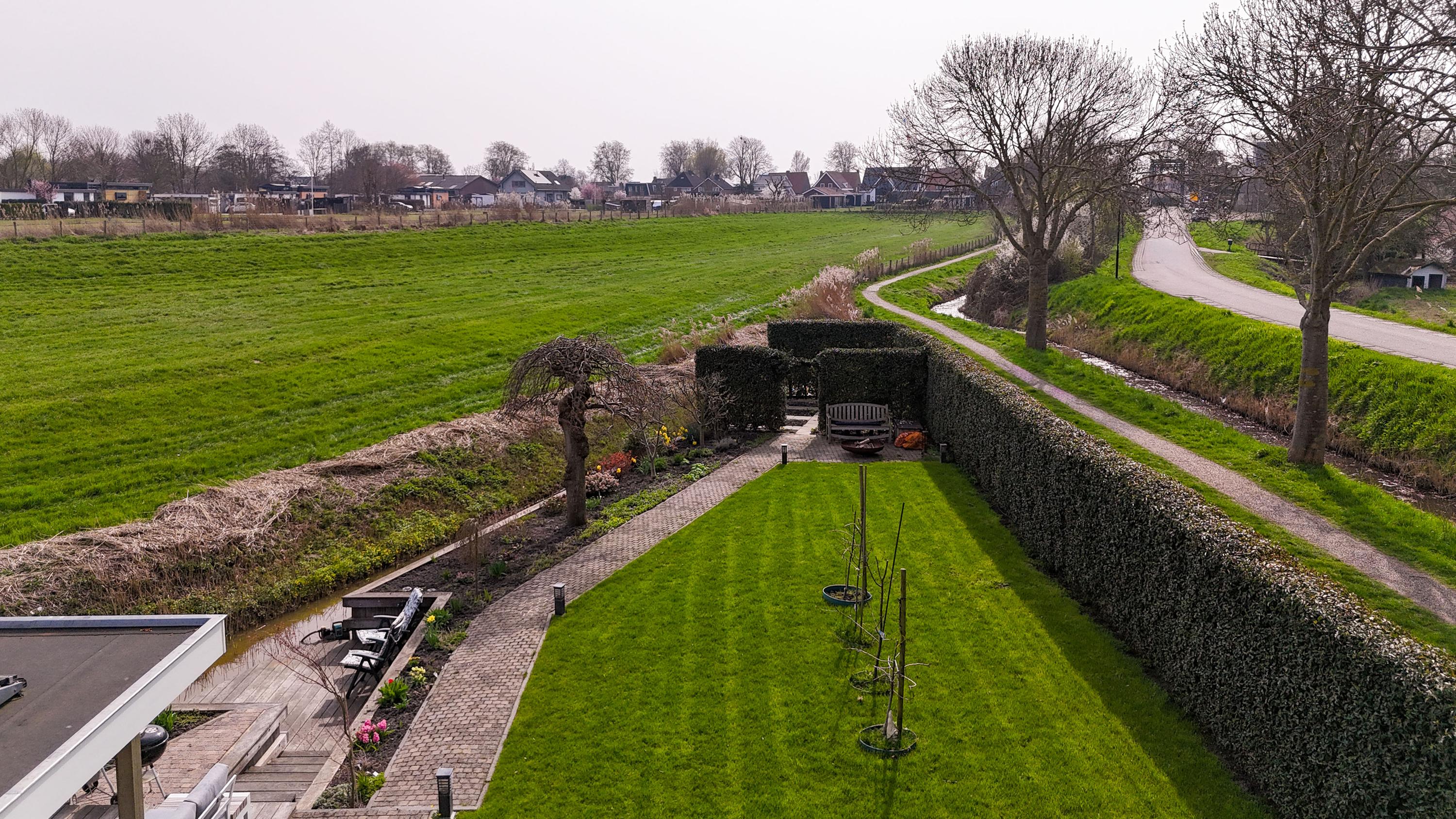 De tuin rondom de woning is met zorg aangelegd en perfect onderhouden. Dankzij een geavanceerd sproei- en druppelsysteem, gevoed door een pomp vanuit de sloot, blijft het groen in optimale conditie. Het ruime terras op het zuiden, voorzien van grote keramische tegels die naadloos aansluiten bij de vloer binnen, vormt een heerlijke plek om te genieten van zonnige dagen. Het elektrische zonnescherm is eenvoudig via een app te bedienen.