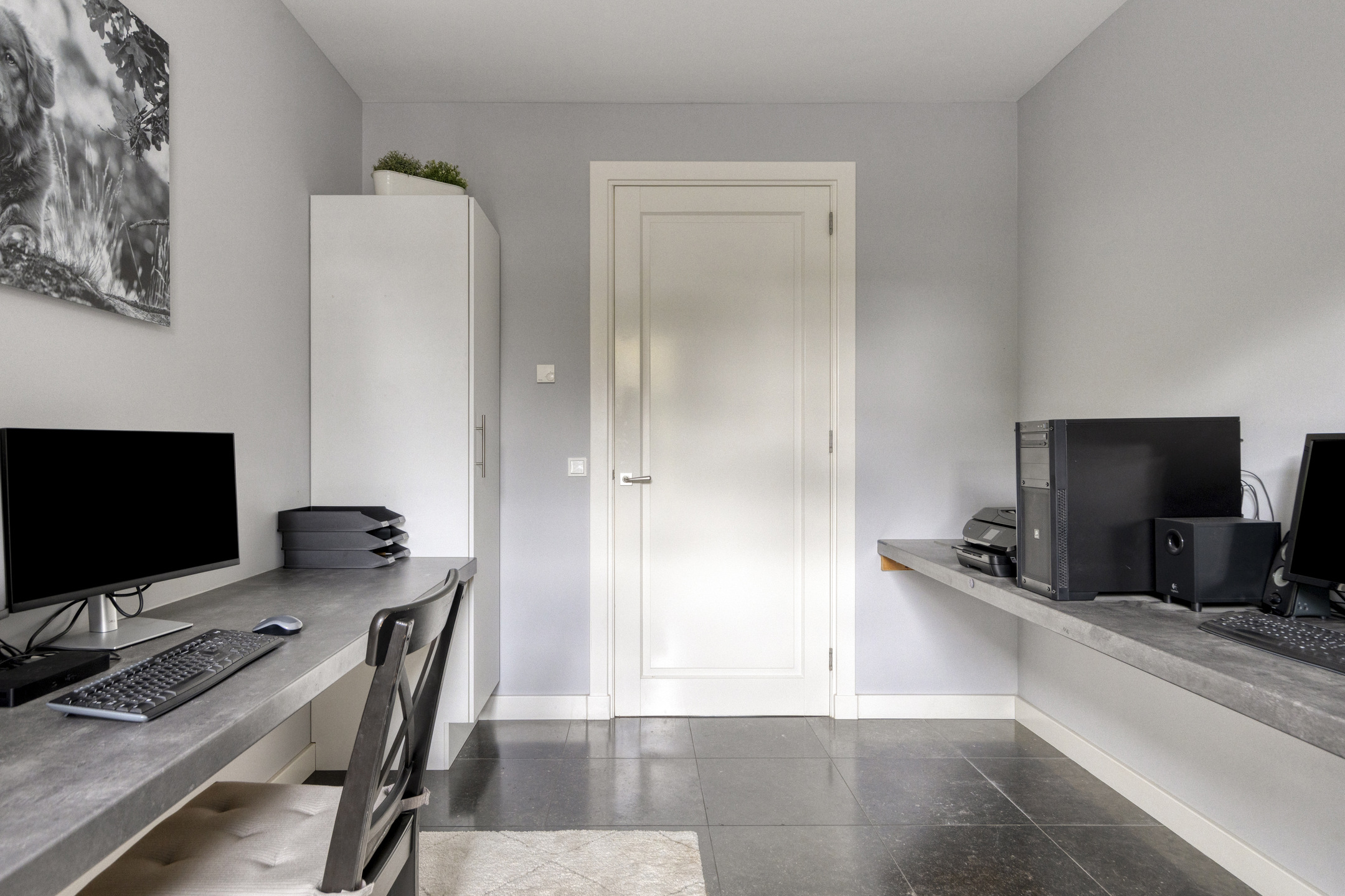 Werk-/speelkamer: wanden gestuct, natuurstenen vloer, plafond gestuct.