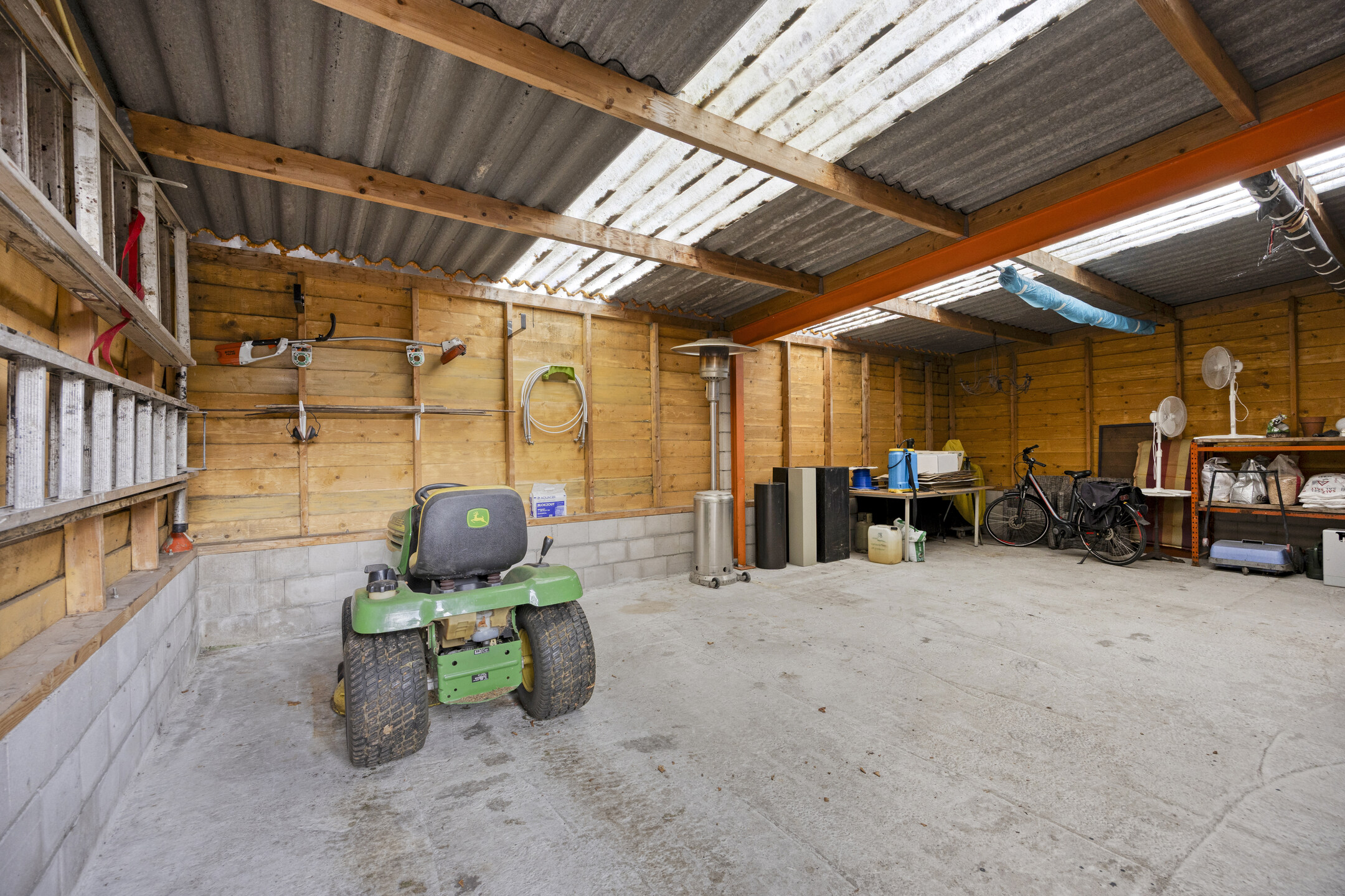 Schuur II (ca. 302 m²) verdeeld in 2 delen, vv. 2x een dubbele houten deur naar oprit/tuin, 3 loopdeuren, elektra, krachtstroom, dakisolatie en 2 bergvides, deels pannendak en deels asbest golfplaten.