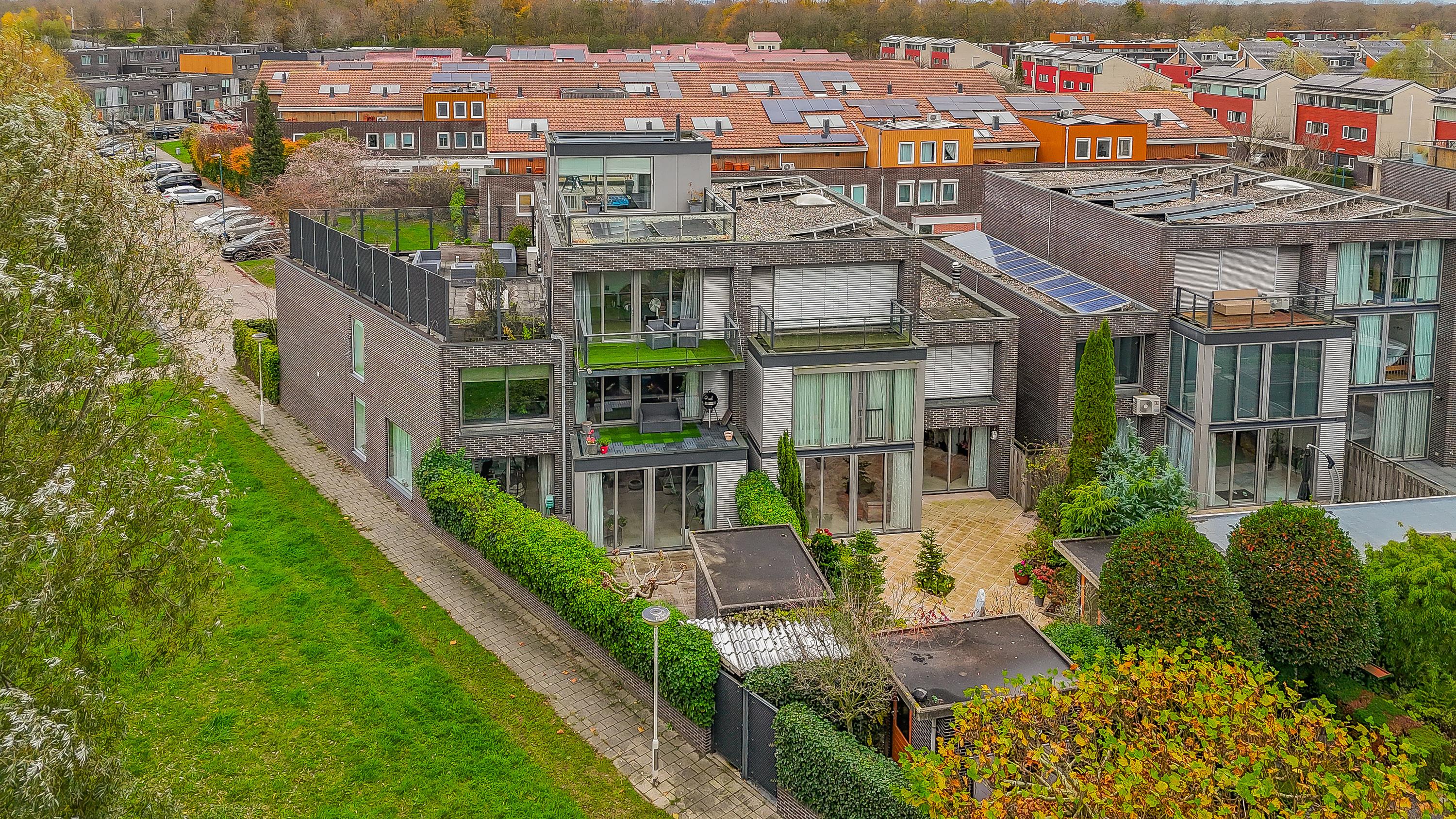De buitenruimte is al net zo indrukwekkend: in totaal 168 m2 aan buitenruimte verdeeld over een ruime voortuin, achtertuin, 3 balkons en 3 dakterrassen. Hierdoor heb je altijd een plek in de zon én privacy. Op eigen terrein is ruimte om te parkeren onder de carport en er is zelfs een eigen laadpaal aanwezig. De ligging in een groene, rustige wijk van Zoetermeer maakt het woongenot compleet. Vanuit de woonkamer kijk je vrij uit over een groenstrook en volwassen bomen – een zeldzame combinatie van ruimte, privacy en natuur binnen handbereik.