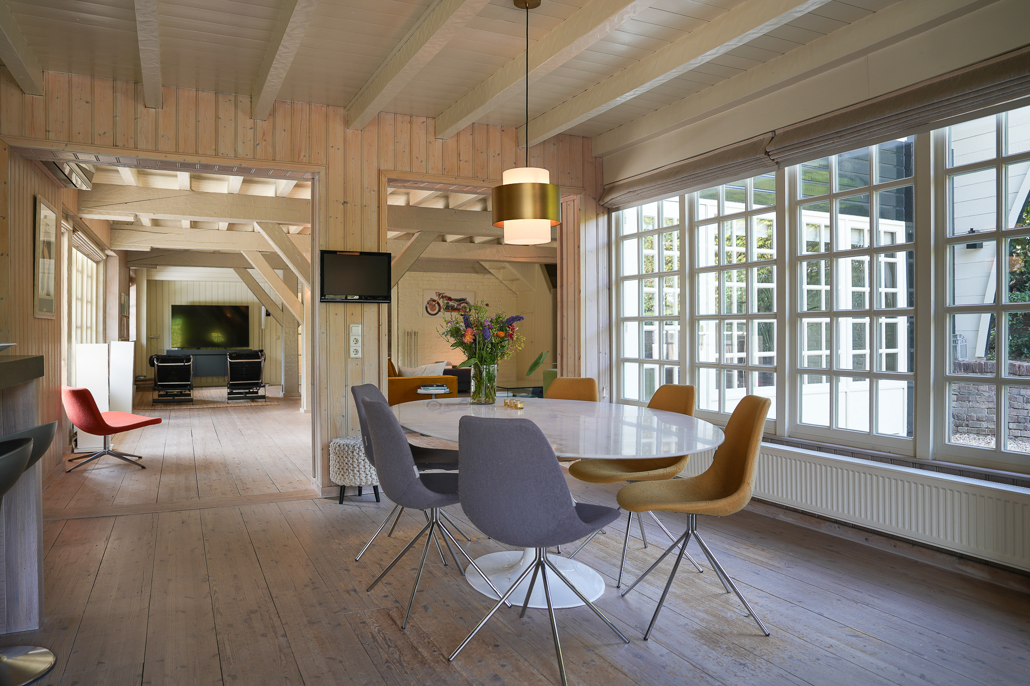 De woonkeuken is eveneens licht en ruim, biedt plek aan een grote eettafel en is voorzien van een luxe, compleet uitgeruste keuken met hoogwaardige inbouwapparatuur. Vanuit hier is er toegang tot een tweede terras dat grenst aan de oprit.