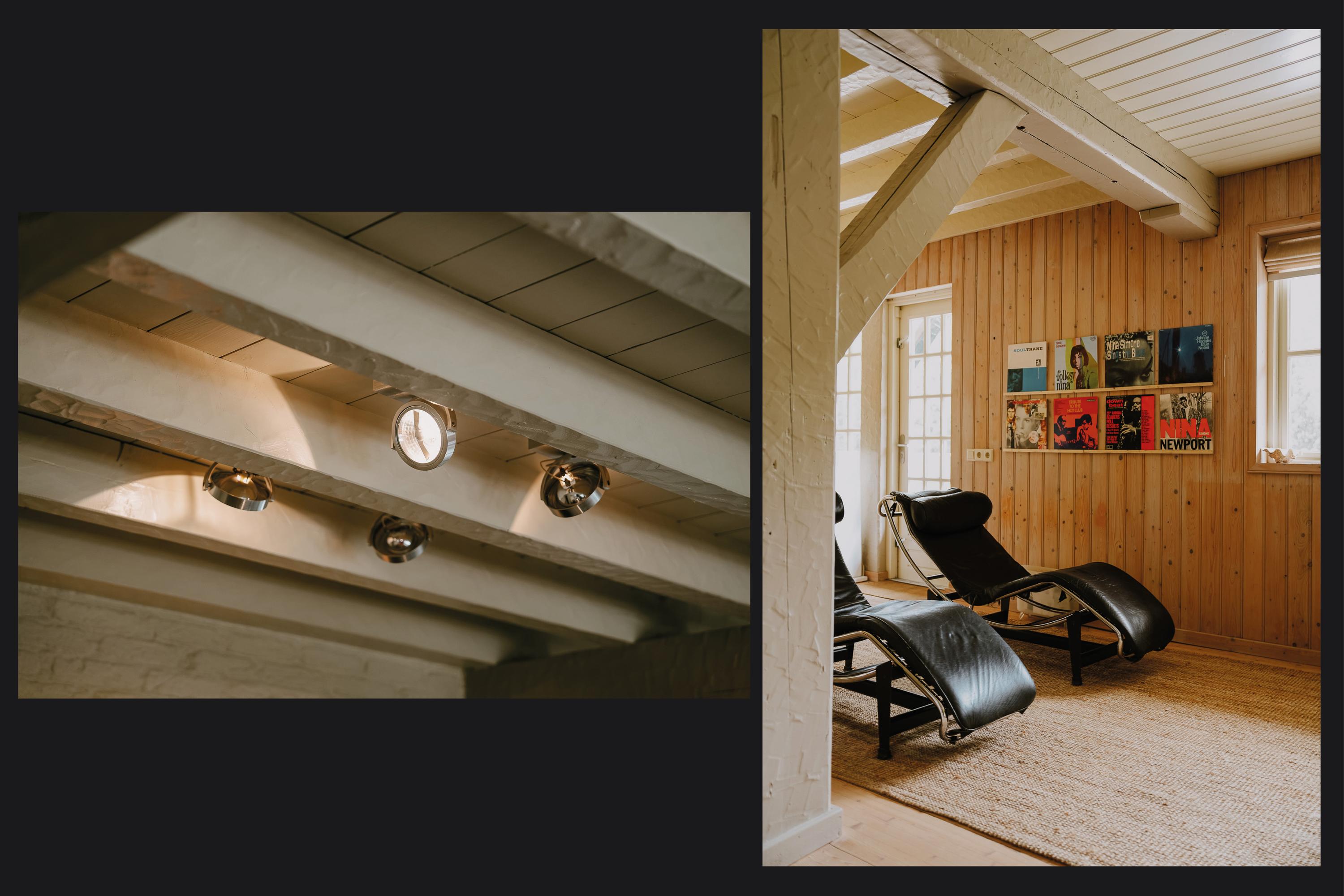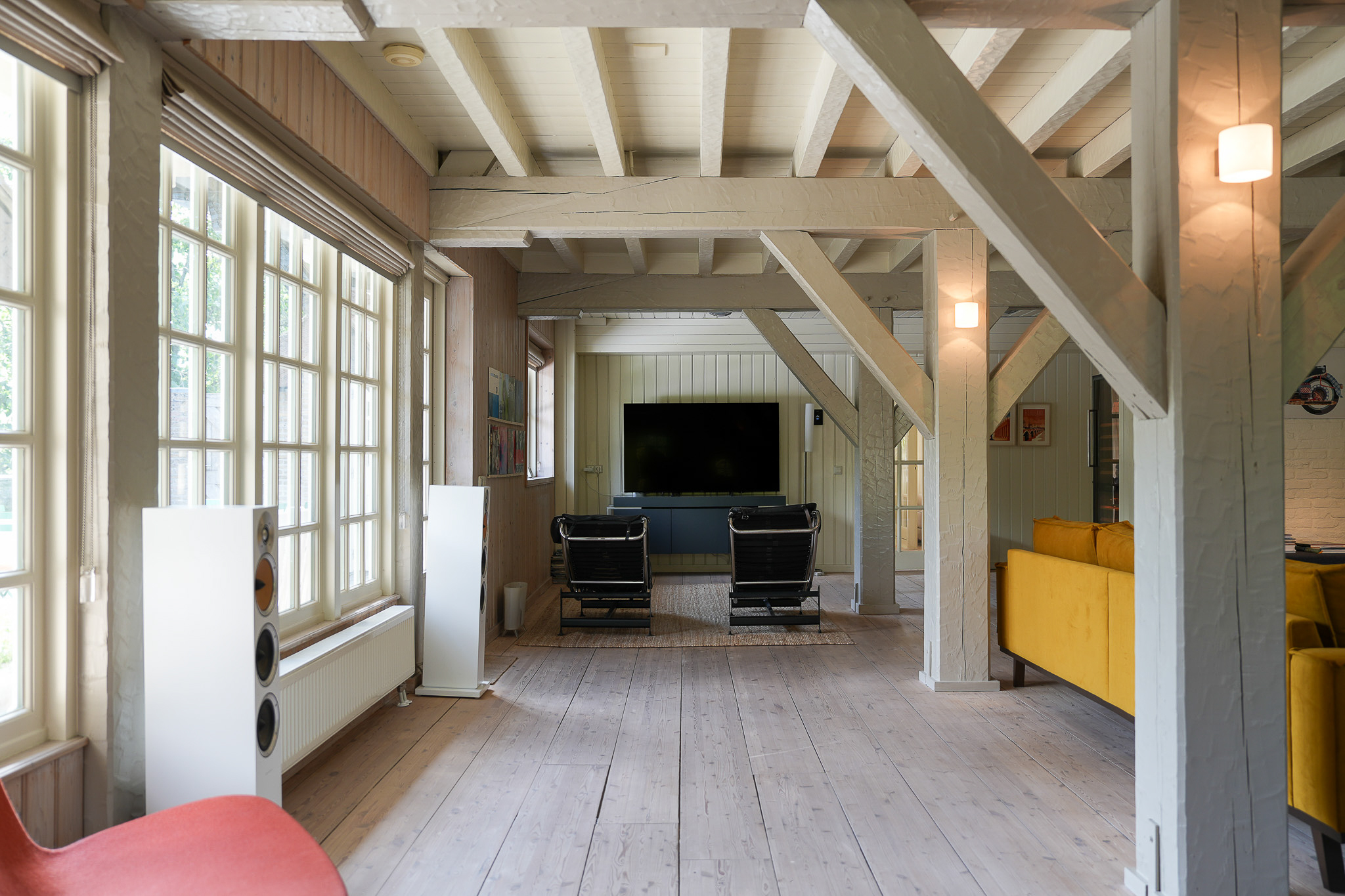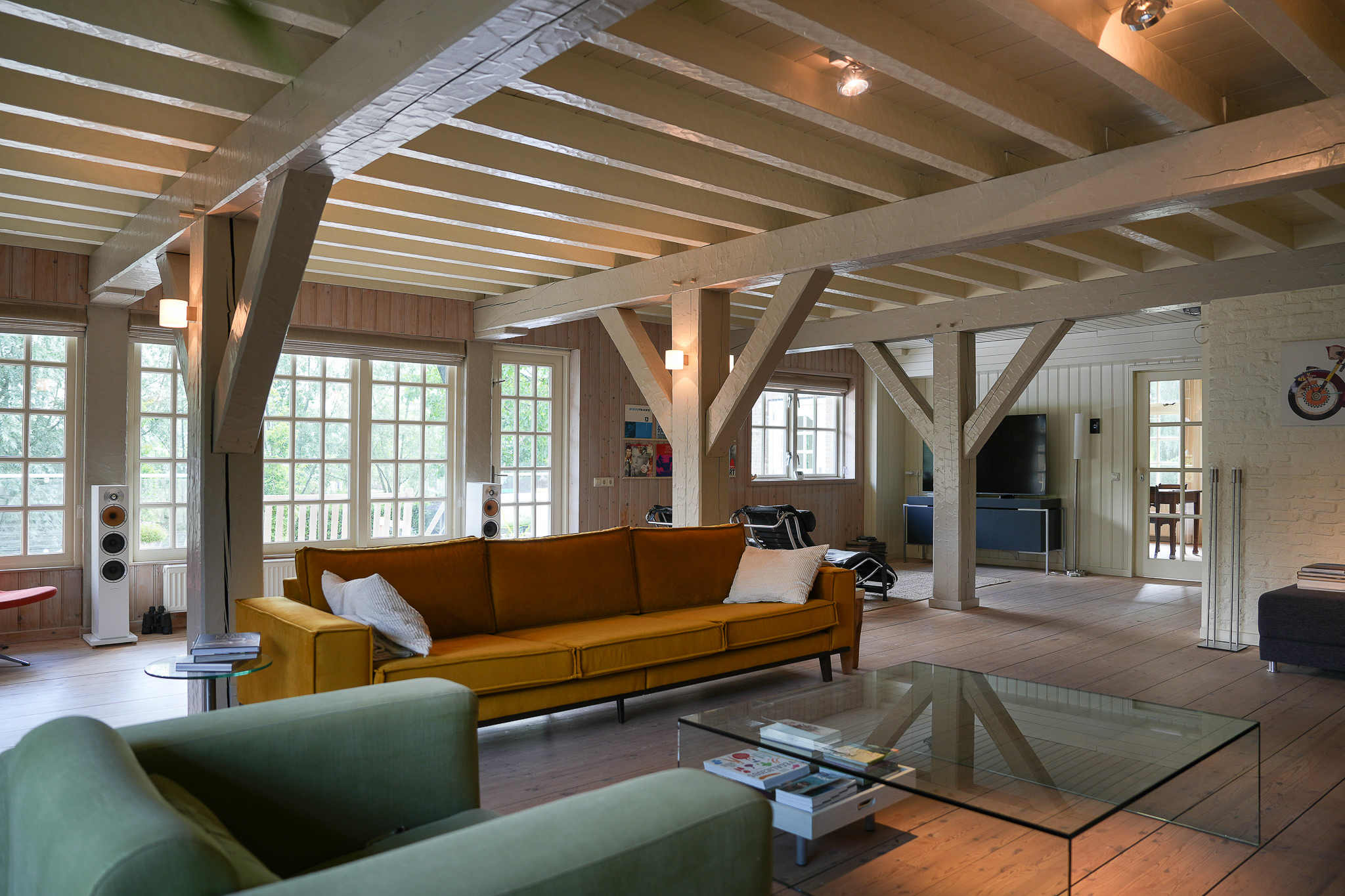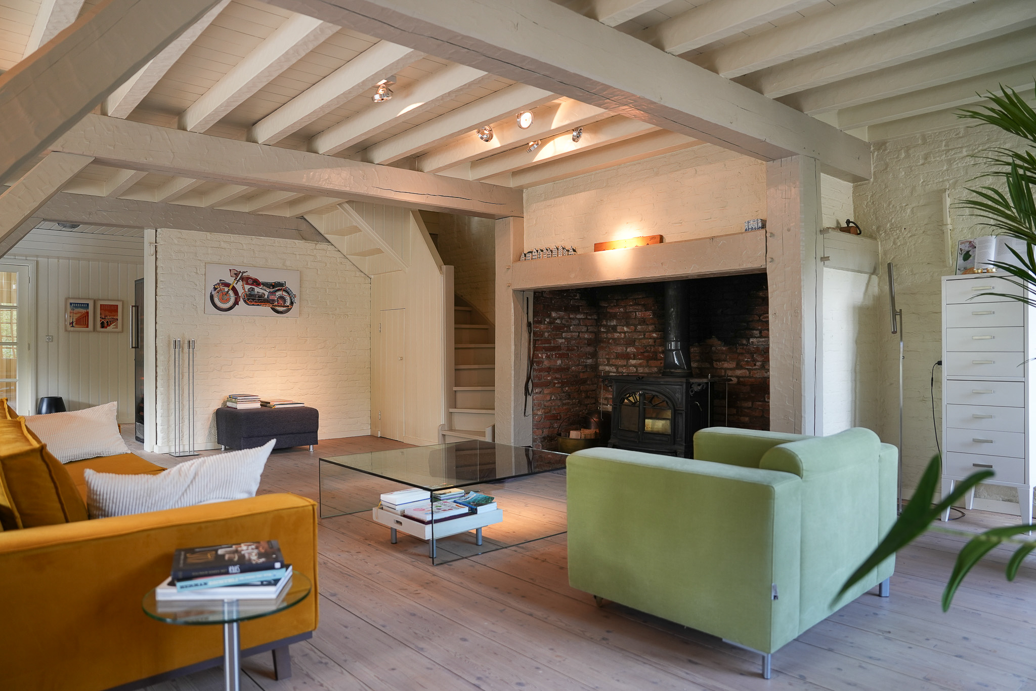 Via de brede pui met roederamen komt men binnen in de imposante leefruimte, waar brede vloerdelen, een houtgestookte kachel en grote raampartijen een warme sfeer creëren.
