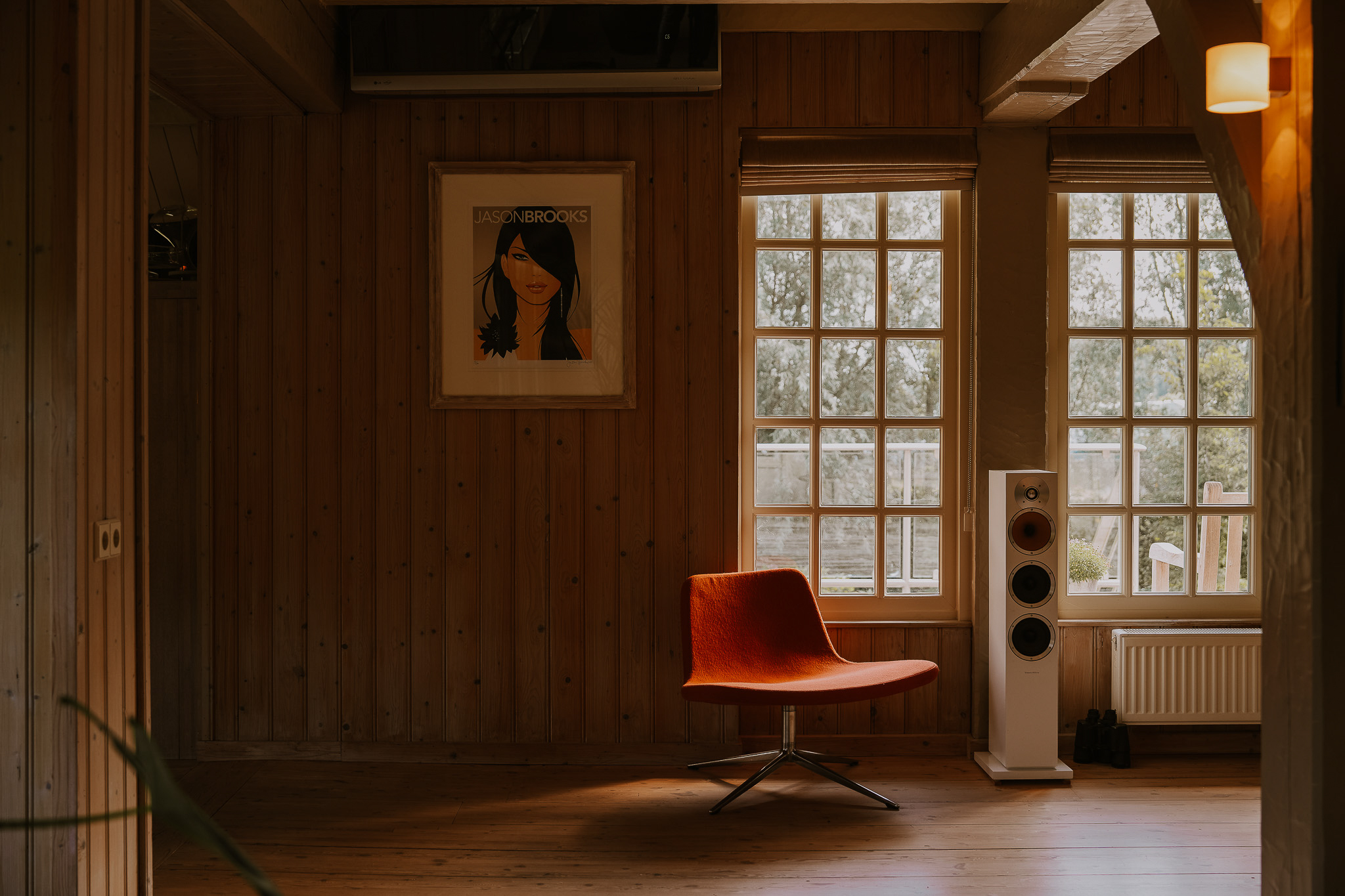 Tuingerichte leefruimte van 140 m² met brede vloerdelen, houtkachel en een compleet ingerichte keuken, portaal naar de gastenkamer met aangrenzende doucheruimte, toilet en werkkamer op de begane grond.