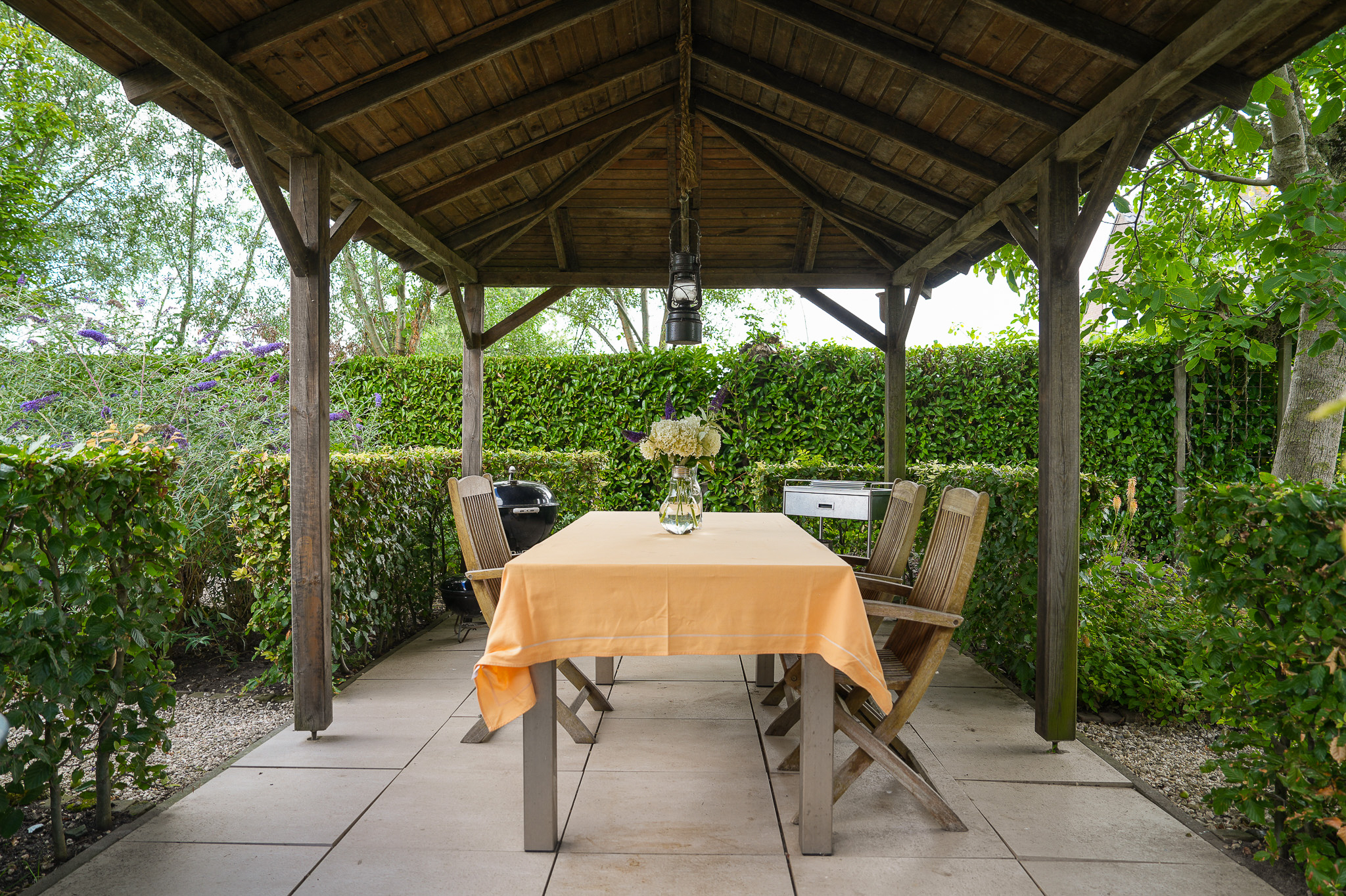 Links van de oprit staat een solide pannengedekt bijgebouw met een dubbele carport, een garage en een motor- en fietsenberging. De tuin is onderhoudsvriendelijk aangelegd met grote hardhouten terrassen, transparante RVS-balustrades, sierlijke hortensiaborders en een gazon met volwassen beplanting. Het talud langs de dijk is ingeplant met onder andere maagdenpalm en goudaardbei. Het dak van het bijgebouw leent zich door de oost/west-oriëntatie bij uitstek voor het plaatsen van zonnepanelen. Bij plaatsing van ten minste 4 zonnenpanelen, gaat het huidige energielabel C naar B.
